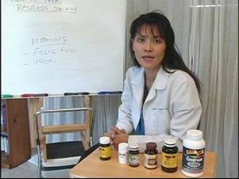 Hello my name is Dr Susan Jewell and on behalf of Expert Village today I’m going to talk to you about how to recognize and treat restless leg syndrome. Now in this clip we’re going to talk about vitamins. Studies have shown that although there are no real known causes of this particular syndrome some research is saying a certain deficiency in vitamins and minerals can actually produce add to higher chance of getting this syndrome. So folic acid and folic acid and iron deficiency can put you at added risk of getting restless leg syndrome, so in your diet, even if you don’t get restless leg syndrome. It’s good to make sure that you also get your daily recommended supplements or intake of vitamins and minerals. So in the local drug store or super markets you can get ready, available as I’ve shown here a lot of these products. Its readily available here we have a bottle of folic acid and you should also make sure that you get your recommended daily dose and that will also help to alleviate symptoms of restless leg syndrome, multi vitamins because a lot of these products have iron included into them but besides taking these supplements its recommended that you take it in from natural foods. So make sure that you eat a lot of foods that contain iron like liver, you know the greens, the green vegetables, contain iron and folic as well. So besides taking in supplements and taking it from the food and the way that you cook your food as well maintain that the benefits are in tact before you eat it. So restless leg syndrome can be prevented or reduced instances by making sure you have the daily intake of the recommended daily vitamins and minerals.