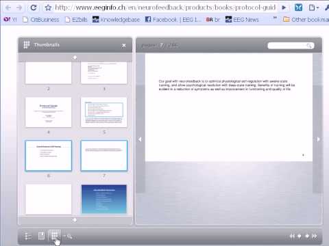 Hi, this is Kurt Othmer from EEG Info and I wanted to tell you about our new on-line edition of the Protocol guide This is a new useful tool for you, gives you the capability to read this on-line, on a computer which gives you searchable capabilities and also four different languages, we have Spanish available, French available, and German available, and of course English To order the new on-line protocol guide go to our website www.eeginfo.com and click here on products up here in the search bar at the top you can type in Protocol Guide and click here on the protocol guide on-line edition down at the bottom it says add to cart and continue with that, and that will get you the new on-line edition of the protocol guide. once you've ordered, you'll receive an e-mail from us that will give you a link to our members area. if you want to log in at another time, and you don't have access to that e-mail you can also access this members area, just by going to our website www.eeginfo.ch this is our partner website and on eeginfo.ch you'll see a login link here in the upper right hand corner click on that, and that will take you to the area where you can type in your username and password which you will also receive from us when you order the on-line protocol guide once you log in, you are going to see this View Protocol Guide On-line you may want to change languages, here you see we are in English we can go ahead and up here change to German, we can change to French, and we can also change to Spanish Those are the languages that the protocol guide is available in right now. Once you've chosen the language that you prefer then you can go ahead and hit View Protocol Guide On-Line and that will launch the on-line protocol guide With the protocol guide launched, first you can click and drag and move the paper Great fun with the animations available here. and I can click on this, and go ahead and scroll around in the protocol guide If you notice that this maybe looks a little small to see this is just the overall view. we can go ahead and hit the zoom in button which allows us to zoom in on a specific page and makes it much bigger and easier to read. I can then hit these arrows on either side to move around between the pages. I can also roll my mouse up and down the page If there is something hidden at the top or the bottom, I can move around on the page nicely. and then continue to hit these right and left arrows to navigate around in the book. for even better navigation I can go down here to the thumbnails. and in the thumbnails, I can actually move all the way around in the book I can use the arrow at the top, I can use the arrow at the bottom, Or I can even use the scroll wheel on my mouse and scroll this down to another area in the book that allows me to get to a specific topic another great way to get to a specific topic in the new on-line edition of the protocol guide is to use the search, which I clicked there at the top now I can type a word, like BRAIN for example and I hit the find button, and this will find all the instances of the word brain. and then I can click on that, and that will take me to the specific slide that has that. I can close this little search box and continue reading from there. If I'd like to bookmark this specific location, I can also do that. and go down to bookmarks, and enter a name for this bookmark and we're going to call this BRAIN and press add and that's going to give me a link to this specific location, so that I can get back to any of the bookmarks that I've saved in the book for a later time. Thank you and I really hope you enjoy the on-line edition of Sue Othmer's new Protocol Guide